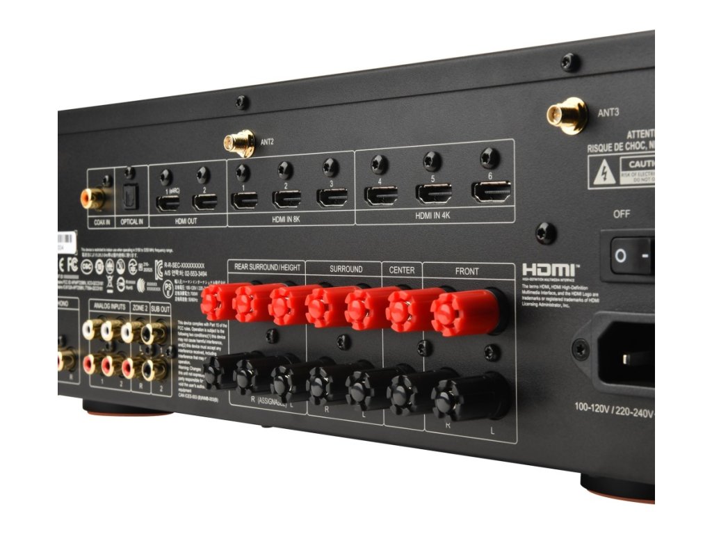 - 6 vstupov HDMI + 1 výstup HDMI kompatibilný s eARC a 1 výstup HDMI pre 2. zónu