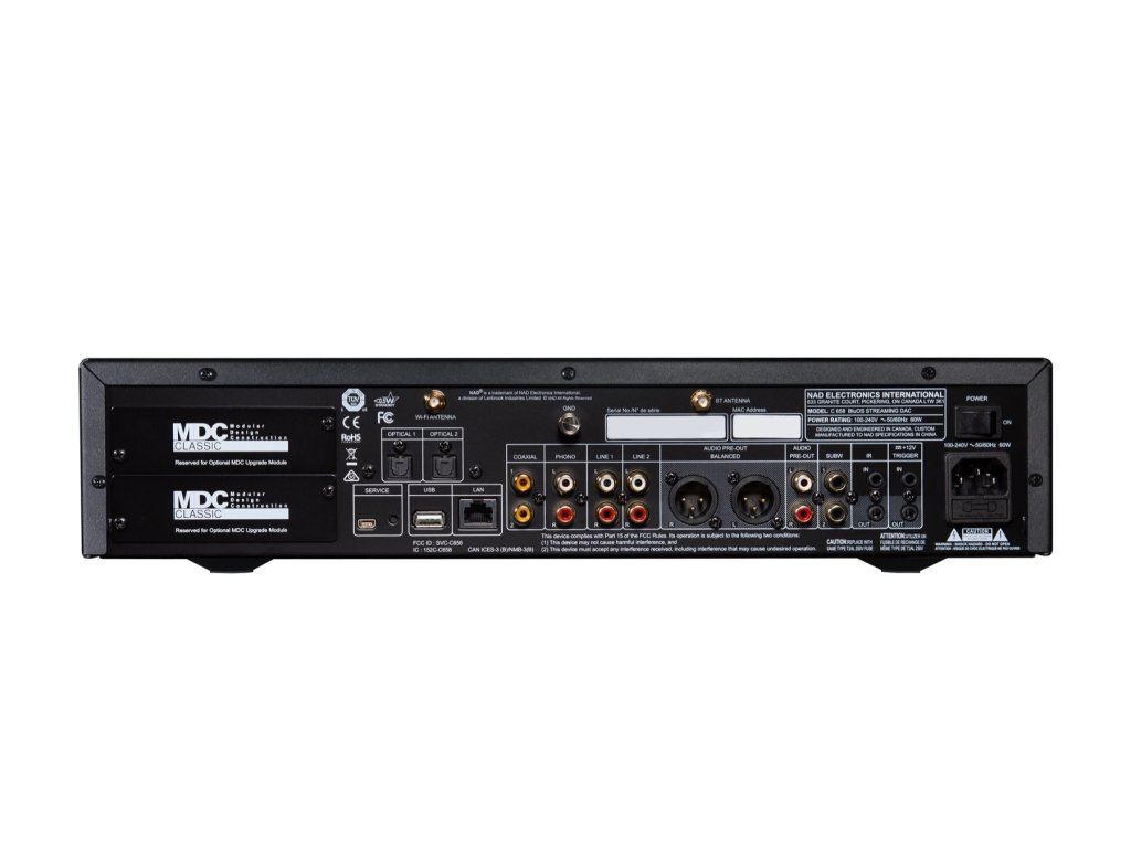 Dva sloty na MDC moduly umožňujú pridať napr. HDMI prepínač MDC HDM-2 s tromi HDMI vstupmi a jedným výstupom a ľahko tak C 658 integrovať s Vaším video vybavením a TV alebo projektorom. Symetrické a nesymetrické výstupy umožňujú pripojenie k prakticky ľubovoľnému výkonovému zosilňovaču. K dispozícii je tiež vysoko kvalitný vstup pre gramofón s MM prenoskou. NAD C 658 podporuje tiež Apple AirPlay 2, takže je jednoduché prehrávať zvuk napr. z YouTube videí, prehrávaných na telefónoch a tabletoch Apple. Pomocou AirPlay 2 je podporovaná aj hlasová asistentka Siri. Z ďalších hlasových asistentov je podporovaná Amazon Alexa pomocou tzv. BluOS Voice Skill, ktorý nainštalujete do aplikácie Amazon Alexa.